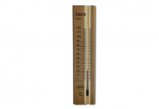 Spiritinis termometras iš termiškai apdorotos drebulės, skirtas matuoti oro temperatūrą pirtyje.