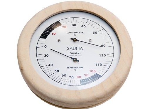 Termometras-drėgmėmatis mediniame rėmelyje, 155 mm. Skirtas matuoti santykinę oro drėgmę ir temperatūrą pirtyje. Drėgmėmatis su sintetiniu siūleliu.